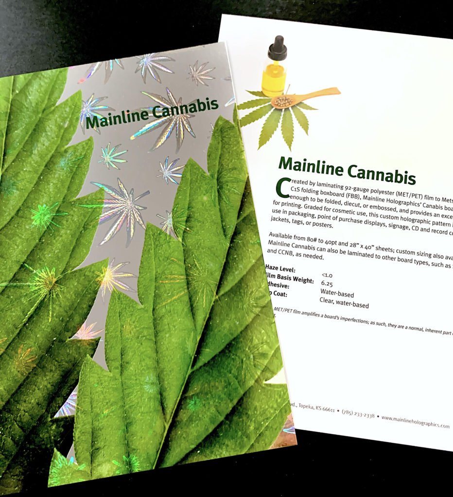 Although the new holographic design is currently stocked as 28 x 40” sheets of 16, 18, and 24pt board, it can be cut to size or applied to label stock, security seal wafers for packaging, and even to paper for printed collateral, such as promo flyers or direct mail campaigns. And if a customer wishes to alter the Cannabis pattern, Mainline’s team of holographic experts can adjust the existing design—or can create an entirely new one—to meet one’s branding needs.