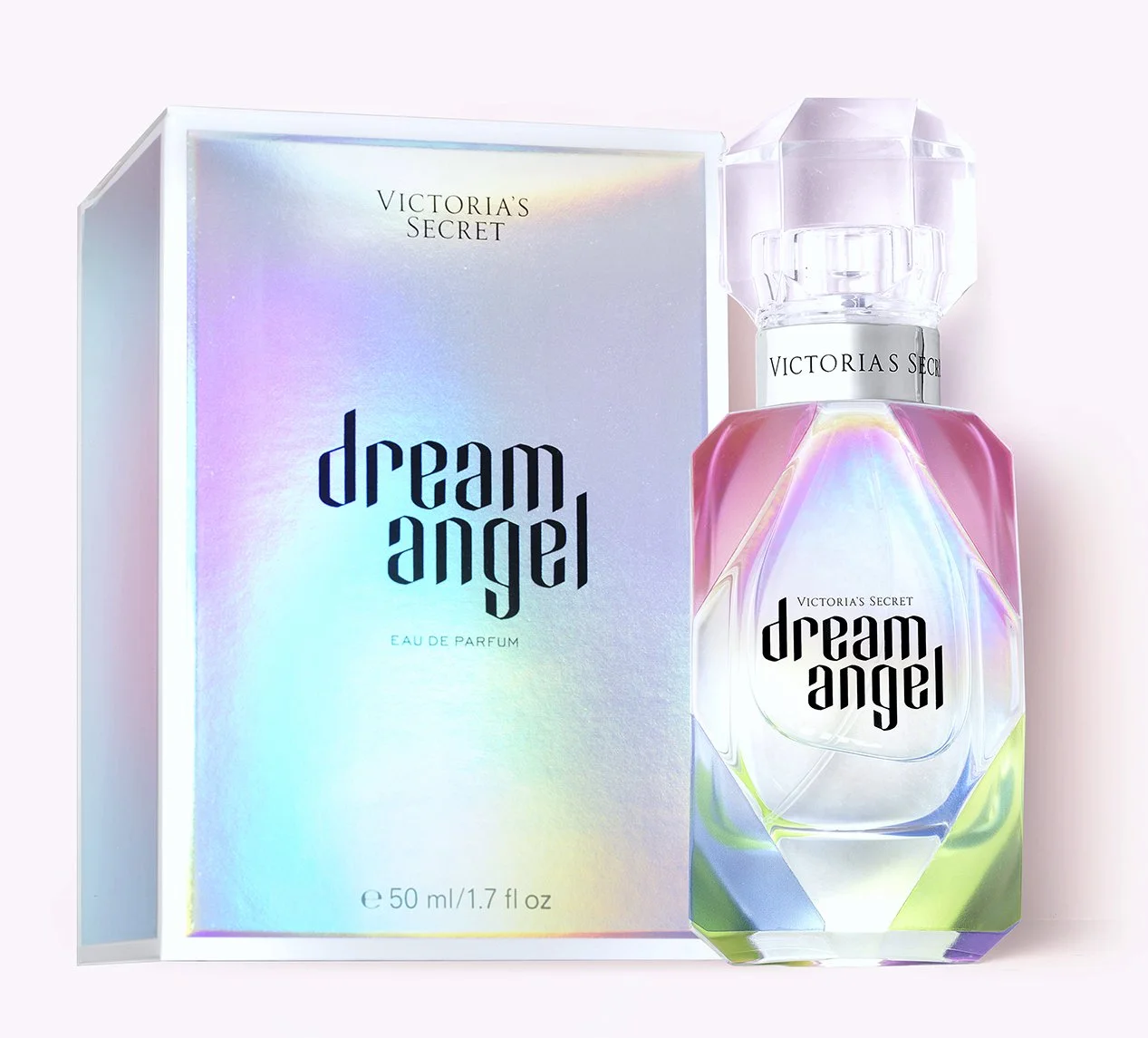 In the case of Dream Angel’s perfume packaging, the original carton design featured pastel clouds on holographic foil. Unfortunately, this no longer fit VS’ rebranding initiative. Moreover, the team needed to reflect the refractive fragrance bottle and the “rainbow glow” scent in the packaging.
