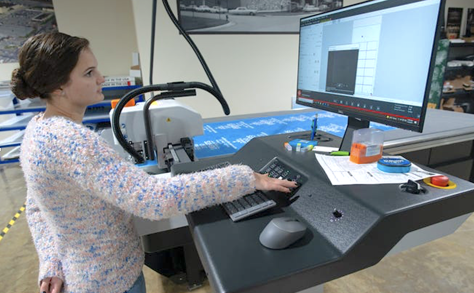 Norton said multiple variables determine how long it takes the machine to finish a project, but some can be completed in 10 minutes. Signs that have finished printing on the flatbed printer are transported across the room to the Esko cutting table. The machine then determines where the edge of the sheet is before it begins cutting each individual sign.