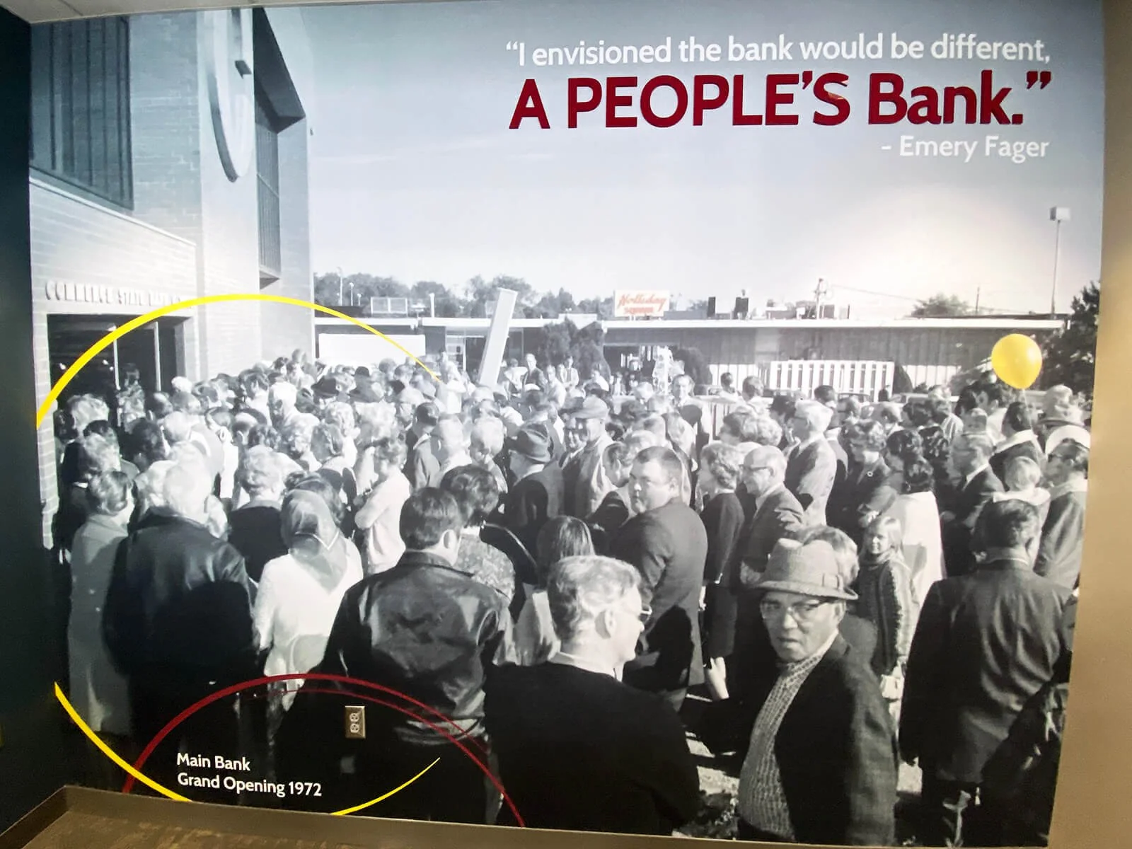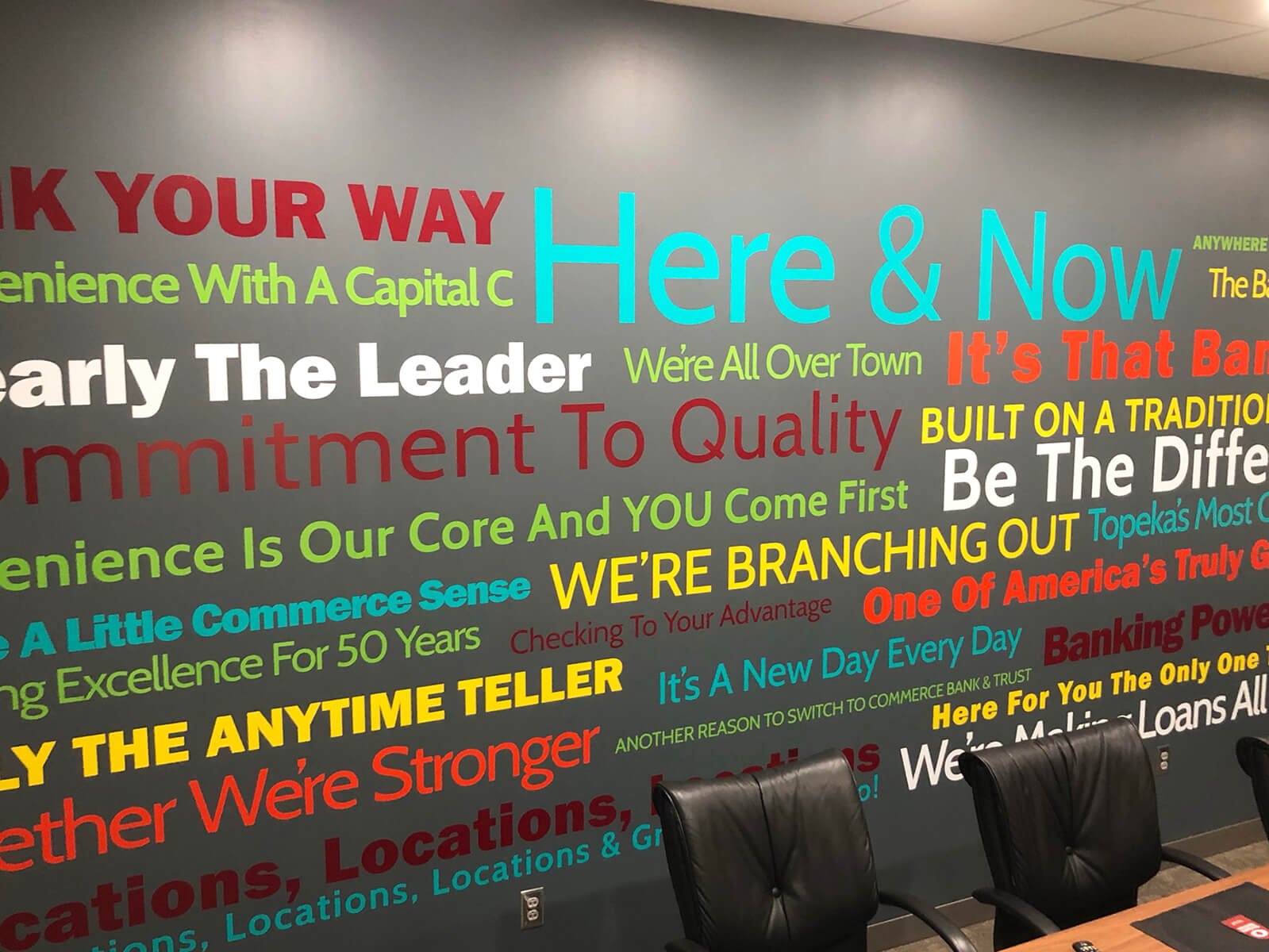 Mainline Signs then worked with CoreFirst to brand their newly renovated headquarters. Modern colors and designs were used to showcase the bank’s history. Vintage photography combined with acrylic letters decorated the walls. Quotes from the founder of CoreFirst, Emery Fager, were utilized as wall accents.